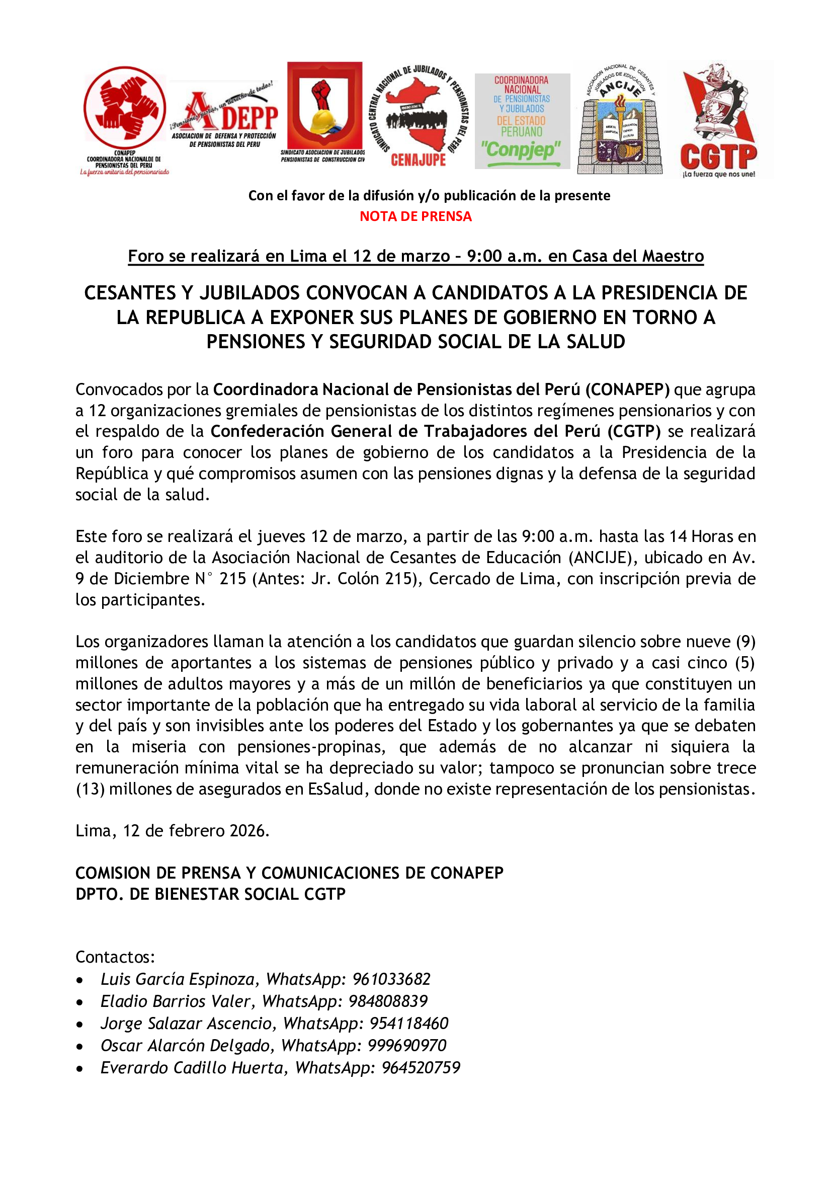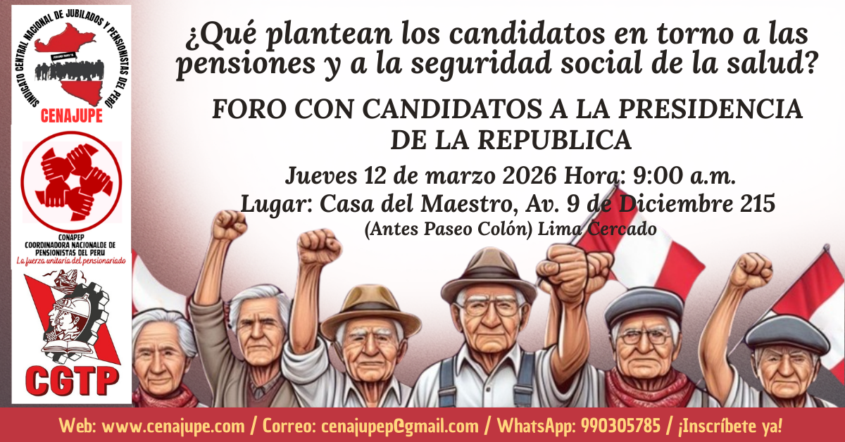 Convocados por la Coordinadora Nacional de Pensionistas del Perú (CONAPEP) que agrupa a 12 organizaciones gremiales de pensionistas de los distintos regímenes pensionarios y con el respaldo de la Confederación General de Trabajadores del Perú (CGTP) se realizará un foro para conocer los planes de gobierno de los candidatos a la Presidencia de la República y qué compromisos asumen con las pensiones dignas y la defensa de la seguridad social de la salud.