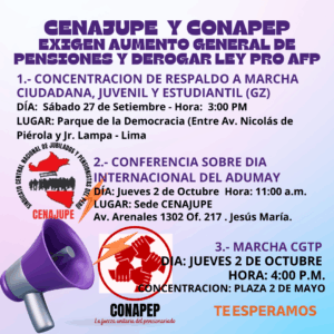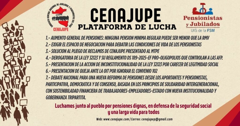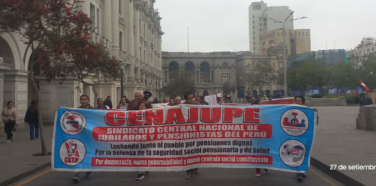 El Sindicato Central Nacional de Jubilados y Pensionistas del Perú (CENAJUPE), en su afán coincidente de pedir la derogatoria de la Ley 32123 denominada de «modernización previsional» y rechazada por la Generación Z (GZ) integrado por jóvenes y estudiantes junto a colectivos ciudadanos y organizaciones gremiales, CENAJUPE participó en la movilización por la solución de una plataforma amplia que encara y responsabiliza al gobierno de Dina Boluarte frente a la inseguridad ciudadana, la corrupción y el crimen organizado
